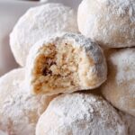 The key is to roll the cookies in powdered sugar while they’re warm but not too hot. Rolling too early when the cookies are steaming or too cold won’t let the sugar stick properly. Also, store the cookies in a cool, dry place to maintain that snowy coating.