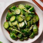 A refreshing and flavorful spicy cucumber salad featuring crisp mini cucumbers tossed in a tangy, sweet, and spicy dressing made with soy sauce, vinegar, sesame oil, honey, garlic, and chili flakes. Garnished with green onions and sesame seeds, this salad is perfect as a light side dish or appetizer.