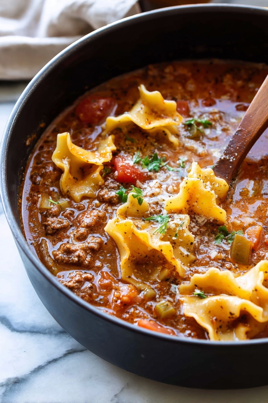 Reheat leftovers gently on the stovetop over medium-low heat, stirring occasionally. If stored with noodles, add a splash of broth or water to loosen the soup. Freshly shred some cheese on top just before serving to revive that melty lasagna comfort.