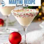 A delightful Sugar Cookie Martini that combines vanilla vodka, Irish cream, amaretto, and milk for a creamy, sweet cocktail perfect for dessert or special occasions. The rimmed glass with vanilla frosting and colorful sprinkles adds a festive touch.
