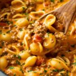 This flavorful one-pot Taco Pasta combines cheesy goodness with seasoned ground beef and a tomato-chile sauce, making a deliciously creamy and satisfying weeknight dinner.