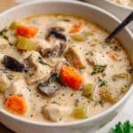 A comforting and hearty turkey and wild rice soup packed with tender turkey, earthy mushrooms, and a flavorful blend of herbs, simmered to perfection and finished with creamy richness. Perfect for cozy meals any time of the year.