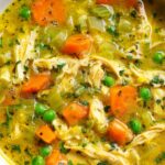 - Shred chicken and add remaining ingredients. Remove the lid and carefully take the chicken out to a cutting board. Allow it to cool slightly, then shred or cut the chicken into bite-sized pieces using two forks. Return the shredded chicken to the pot along with the frozen peas if using, and fresh parsley. Bring the soup back to a slow simmer and cook for 5 minutes until the peas are bright green and tender.