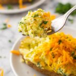 This Vegan Cheesy Broccoli Twice Baked Potatoes recipe features fluffy baked russet potatoes filled with a creamy, dairy-free cheese sauce made from butternut squash and cashews, combined with steamed broccoli and topped with optional non-dairy cheddar shreds for a comforting and nutritious plant-based meal.