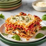 This Best Vegetarian Lasagna recipe features roasted cremini mushrooms, red bell pepper, zucchini, and onion layered with a flavorful ricotta filling, fresh spinach, marinara sauce, and cheeses. Baked to bubbly perfection and garnished with fresh herbs, it makes a comforting and hearty vegetarian main course perfect for family dinners.