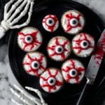 I keep my leftover Veyeball Cupcakes covered in an airtight container in the fridge. Because of the buttercream and jam, refrigeration is key to maintain freshness and keep the ‘blood’ from becoming sticky or runny. Bring them back to room temperature before serving for best flavor.