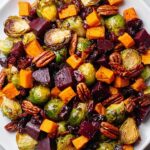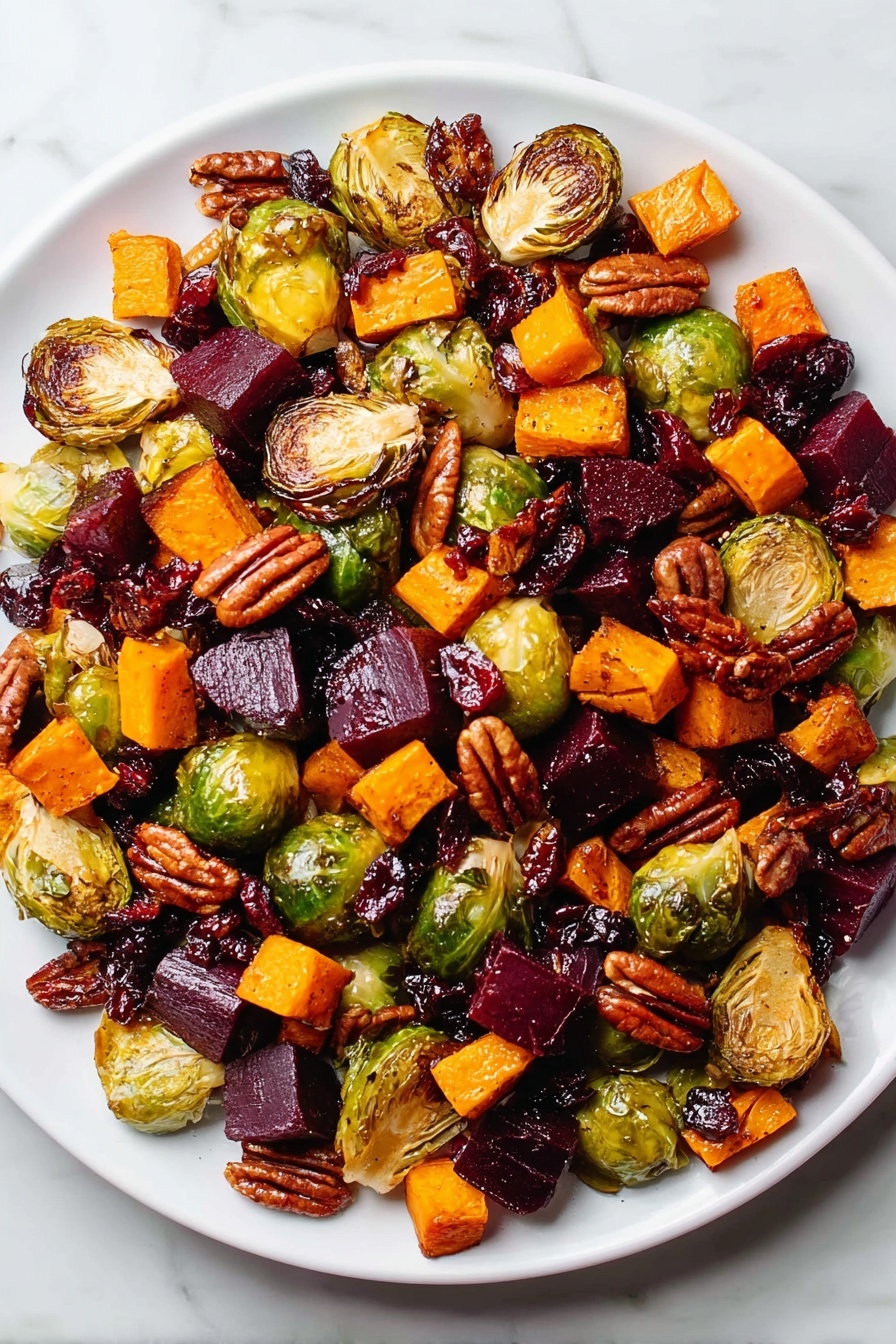 A vibrant and hearty winter vegetable salad featuring roasted Brussels sprouts, butternut squash, and tender beets, tossed with toasted pecans and dried cranberries. Choose between a sweet maple-lime dressing or a rich balsamic glaze for a perfect balance of flavors, ideal for a festive side dish.