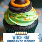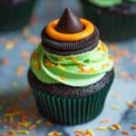 - Assemble the Cupcakes: Place an Oreo witch hat on top of the piped green frosting on each cupcake.